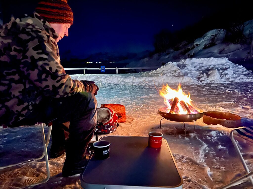 Da ich nicht weiß wie der Glühwein wirkt, und wieviel mein Körper verarbeiten kann, bevorzuge ich noch ein Sitzmöbel vor der Flamme. Nun passt alles und wir können ein paar Stunden draußen verbringen, ohne zu frieren, und der Leber ein bisschen Arbeit schicken. Es soll auch laut dem norwegischen Kachelmann der letzte Abend sein für geschätzte 2 Wochen.