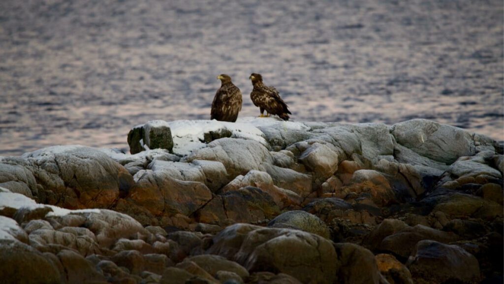 „Schuld“ sind die Fischkutter vor der Küste, die ihren Fang säubern. Alles was sie nicht brauchen, geht beim Säubern über Bord. SOFORT sind gefühlte 1 Mio. Möwen da, und die Adler dazwischen. Jede Menge sogar; ich habe in einem „Schwarm“ 11 Adler zählen können, unglaublich.