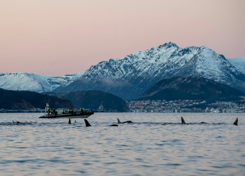 Also geht es eine Bucht weiter, wo wir wieder auf die Suche gehen. Dieses Mal nicht nach Fontänen, sondern nach Rückenflossen, die aus dem Wasser schauen und die Wellen durchpflügen. Und siehe da… kaum sind wir „ums Eck“, tauchen die ersten Schwarz/Weißen auf. Das Herz pocht vor Aufregung – bei mir nicht so schlimm, denn es ist ja nicht das erste Mal, dass ich Orcas im Wasser vom Boot aus beobachten darf. Das Glück hatten wir 2019 im Sommer schon ein paar Kilometer südlicher.